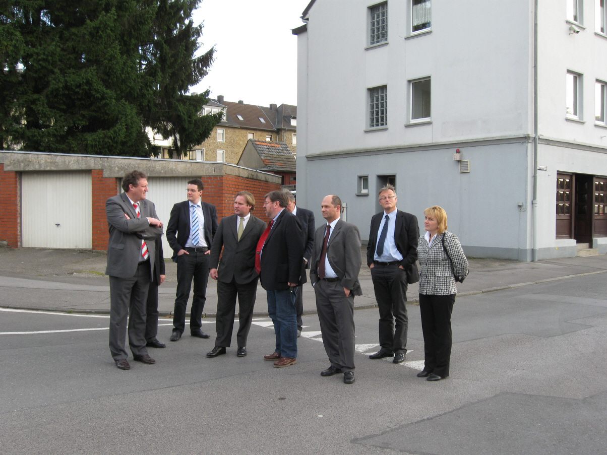 Der Bundesminister für Verkehr, Bau und Stadtentwicklung Wolfgang Tiefensee besuchte am 18. August das Stadtteilbüro Soziale Stadt NRW Stolberg-Velau/Auf der Mühle. Das Stadtteilmanagement, das im Auftrag der Stadt Stolberg von B-PLAN DR. JOUSSEN durchgeführt wird, informierte Minister Tiefensee über den Stand der Umsetzung des Ende 2008 gestarteten Projektes. Der Minister hob die Bedeutung des hier gewählten Ansatzes von "Sanieren, Qualifizieren und Integrieren" für eine positive Entwicklung im Stadtteil hervor. Im Anschluss an Vorträge und Diskussion im Stadtteilbüro in der Mittelstraße sah sich Minister Tiefensee bei einem Rundgang im Stadtteil um. Tiefensee stellte beim Rundgang eine Erhöhung der Fördermittel des Bundes für das Programm SOZIALE STADT in der kommenden Legislaturperiode in Aussicht.